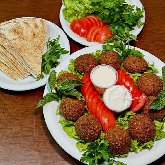 Pão Libanes, bolinhos de falafel VEGANO , salsinha, tomate, alface e tahine.