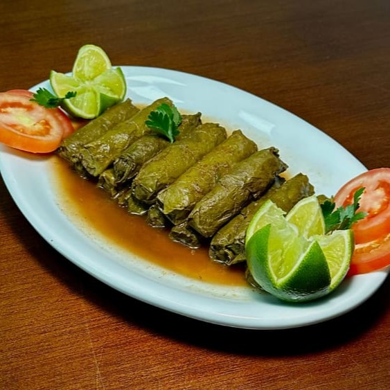 Folhas de uva recheadas com arroz e carne moida.
