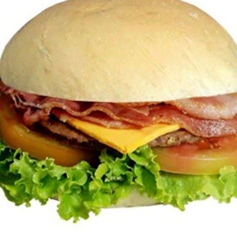 Pão de hambúrguer, alface, tomate, hambúrguer 90g, fatias de bacon e queijo mussarela
