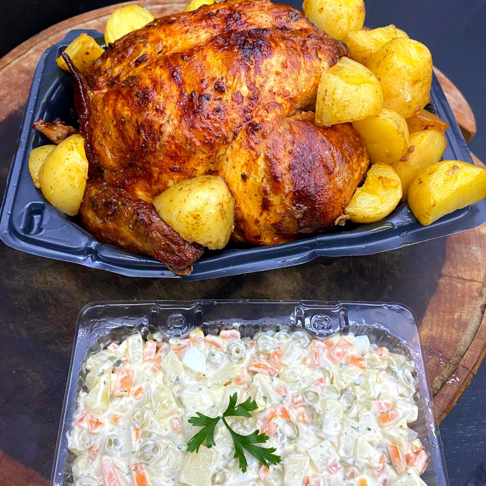 Frango assado Maionese de legumes batata ,cenoura, vargem, salsinha, Maionese hellmans + cola cola