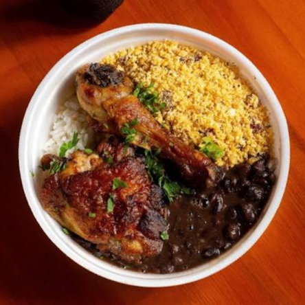 Marmita acompanha: Arroz, feijão, farofa, carne assada, frango.