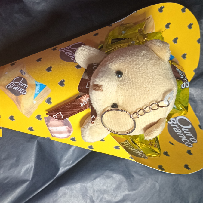 Buquê com bombons ouro branco e um chaveiro de ursinho