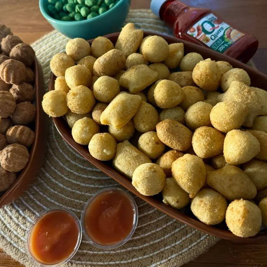 Apresentamos uma seleção irresistível de 80 mini salgadinhos, cada um pesando 11g, meticulosamente produzidos com uma divina massa de batata. Fritos em puro óleo de algodão, essas pequenas joias gastronômicas garantem uma casquinha crocante e dourada por fora, contrastando com um interior macio e suculento por dentro + 1L de Guarana Antártica