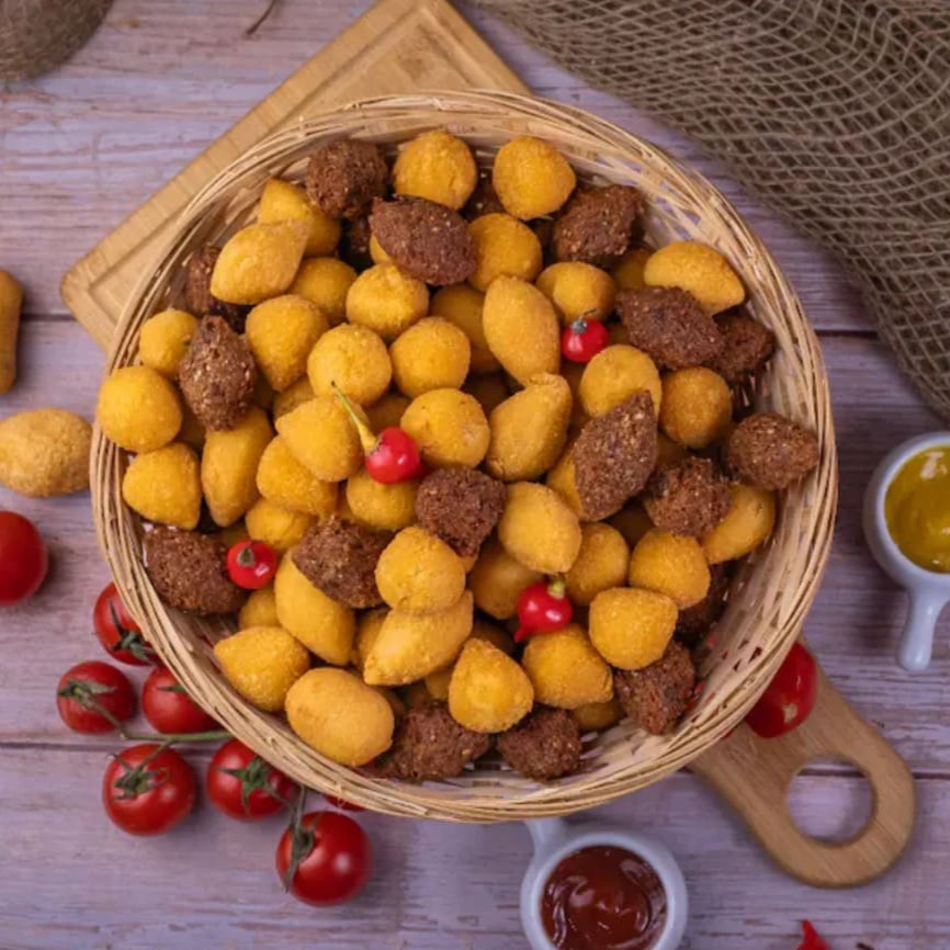 Apresentamos uma seleção irresistível de 120 mini salgadinhos, cada um pesando 11g, meticulosamente produzidos com uma divina massa de batata. Fritos em puro óleo de algodão, essas pequenas joias gastronômicas garantem uma casquinha crocante e dourada por fora, contrastando com um interior macio e suculento por dentro + 20 churrinhos Grátis