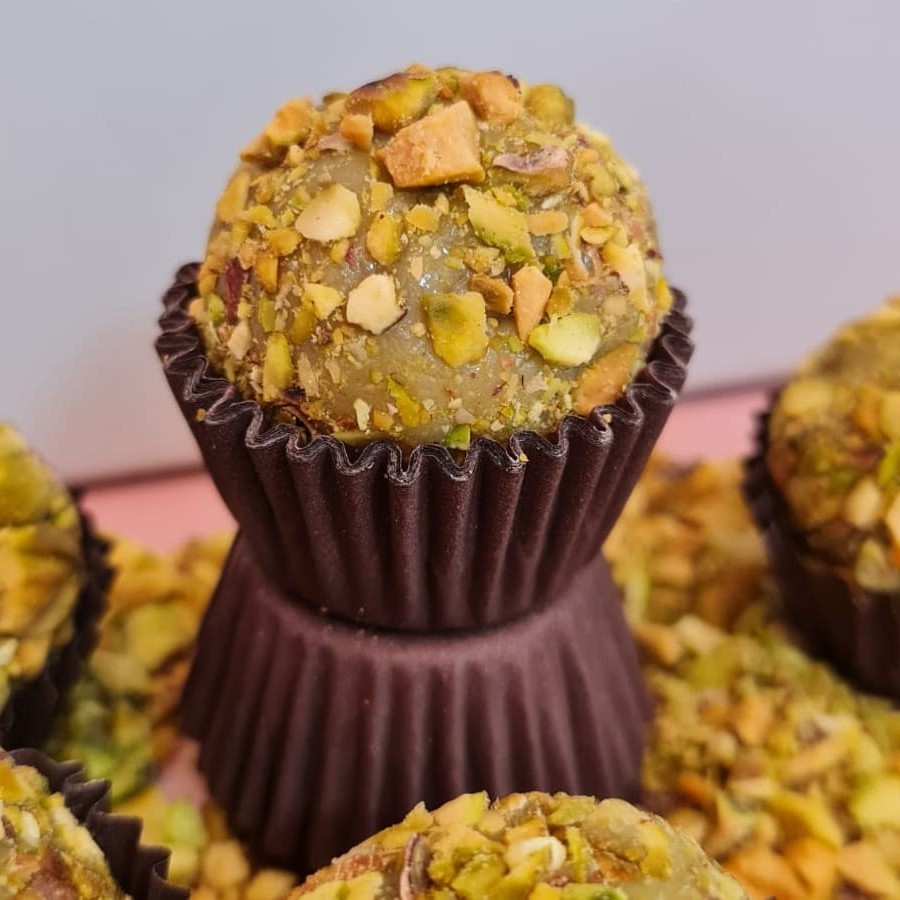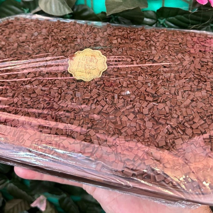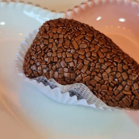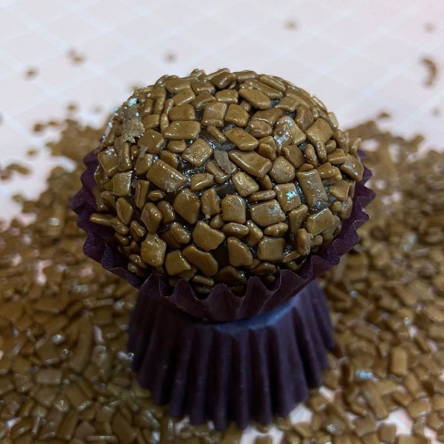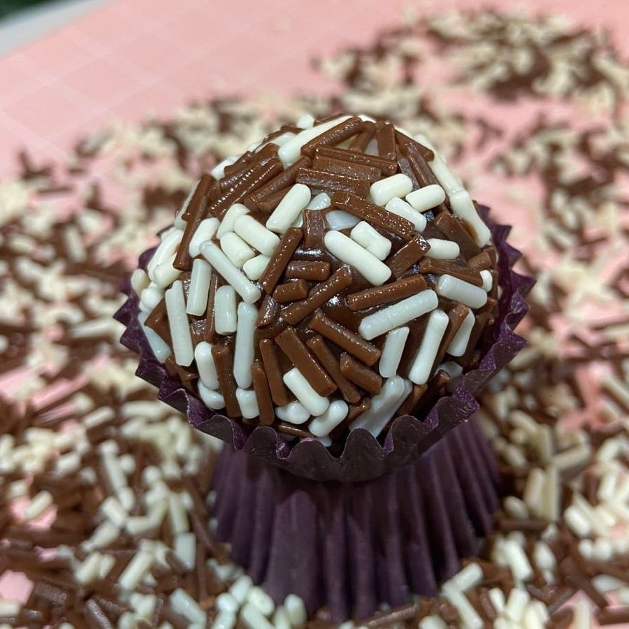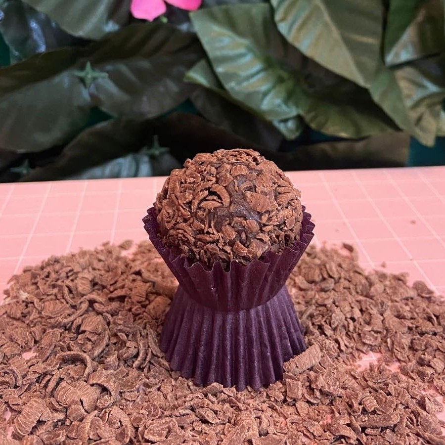 Brigadeiro de chocolate belga envolvido no granulado callebaut.