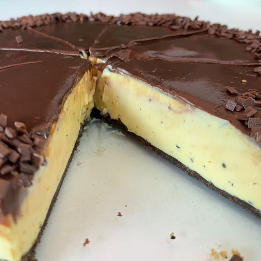 Torta de maracujá, com base de bolacha maisena com chocolate, recheio de mousse de maracujá, coberta com ganache de chocolate meio amargo.
