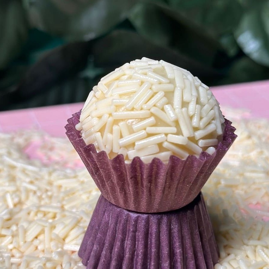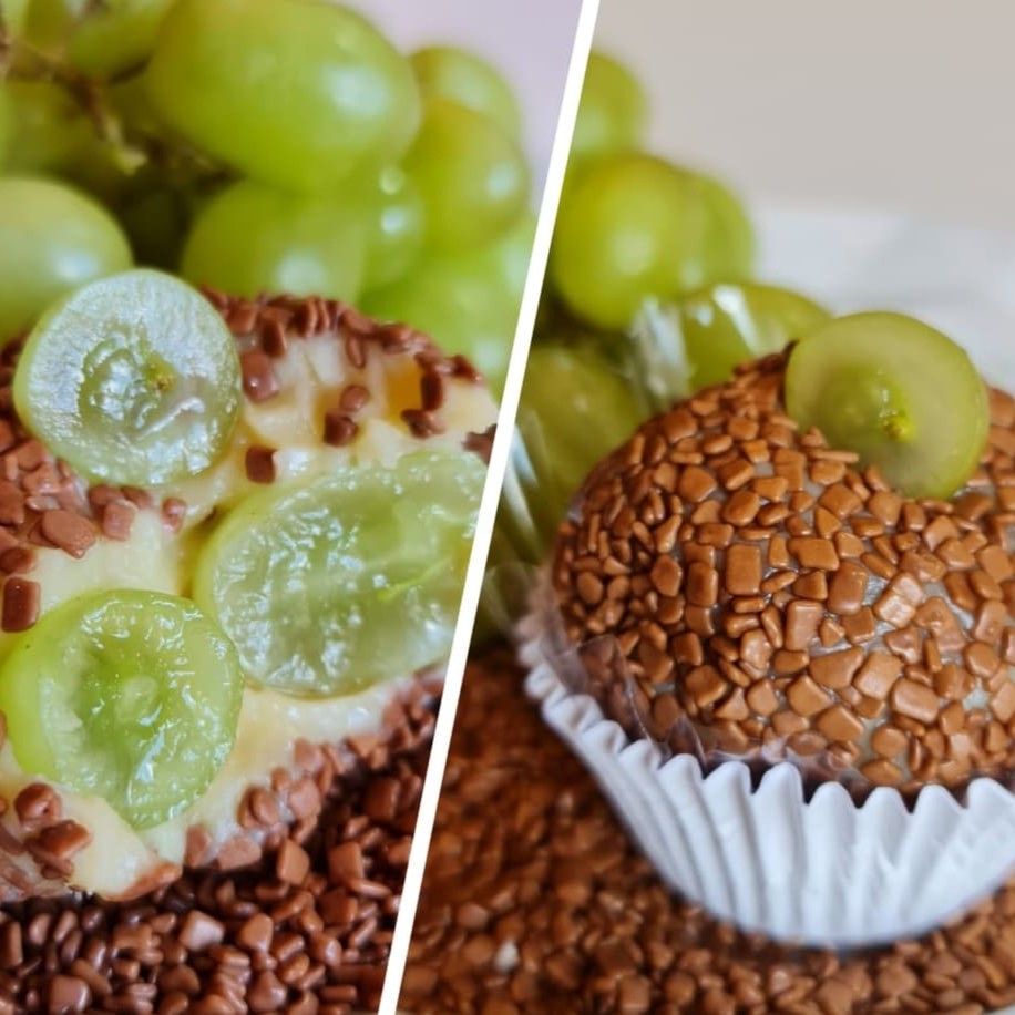 Uvas sem semente envolvidas no brigadeiro de massa branca coberto com granulado belga callebaut