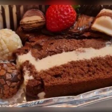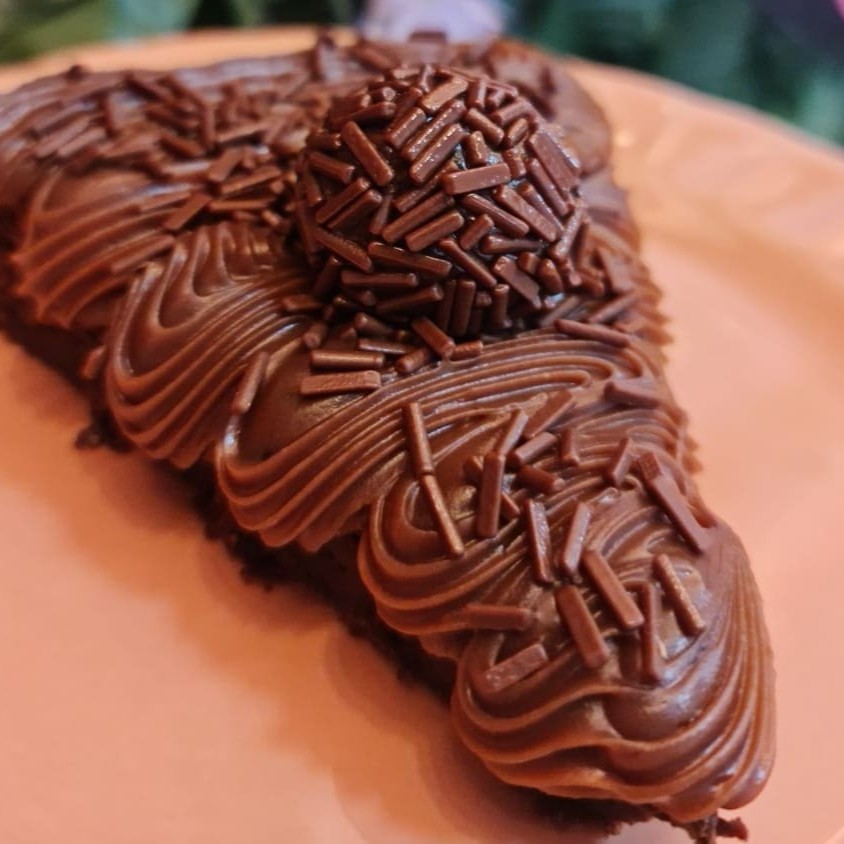 Deliciosa combinação de bolo de chocolate com recheio de Kinder Bueno e Nutella e 2 brigadeiros no tamanho festa.