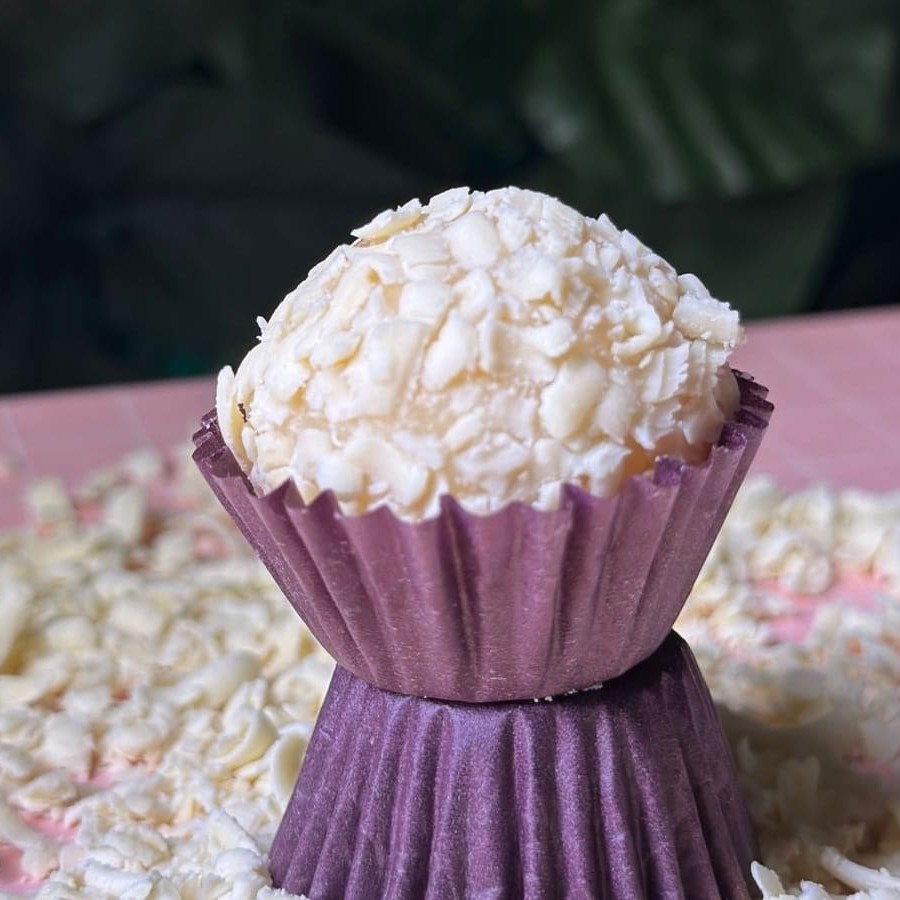 Brigadeiro de chocolate branco com uma uva sem semente.
