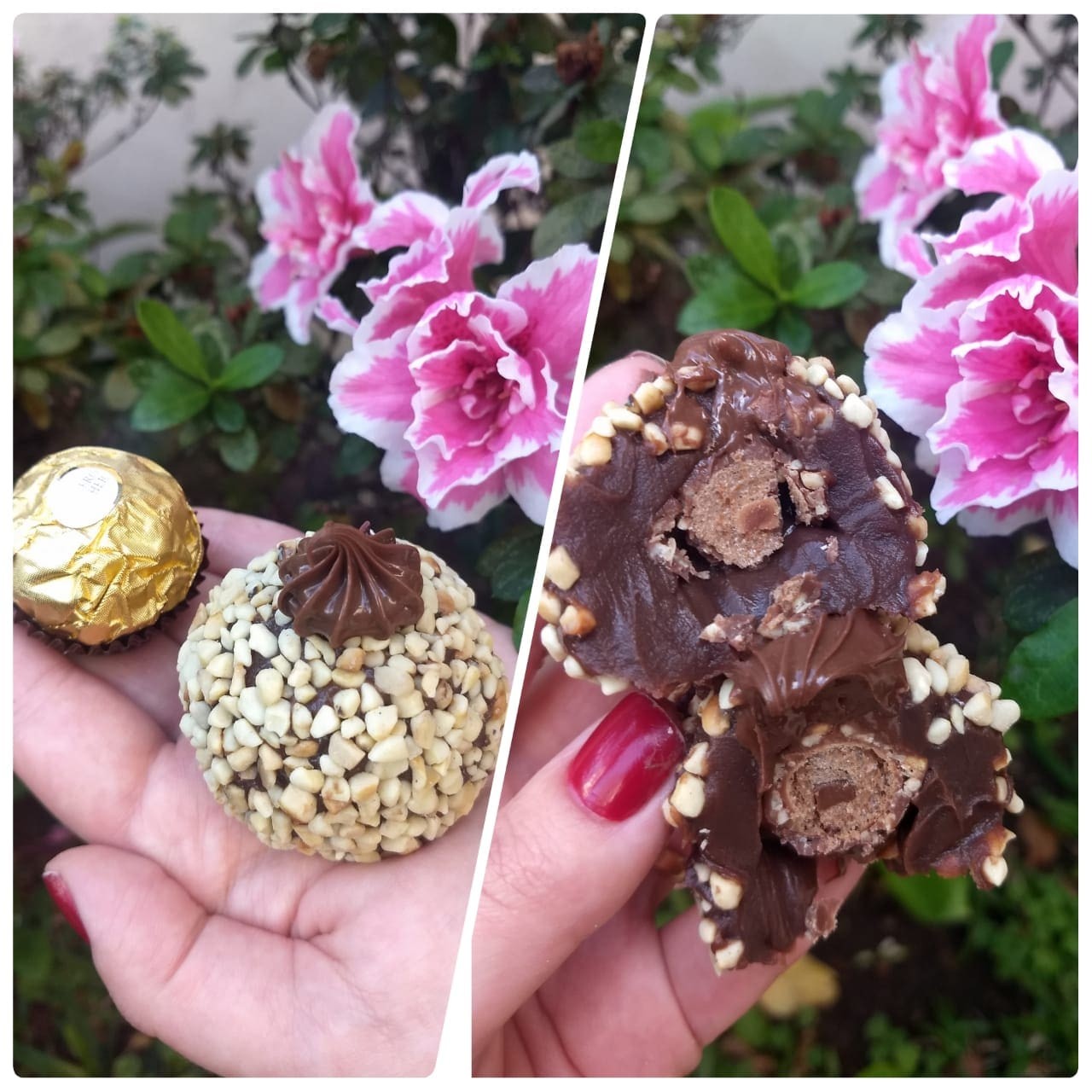 Ferrero rocher envolvido no nosso exclusivo brigadeiro de chocolate, envolvido em castanha de caju (xerém) com pitanga de Nutella