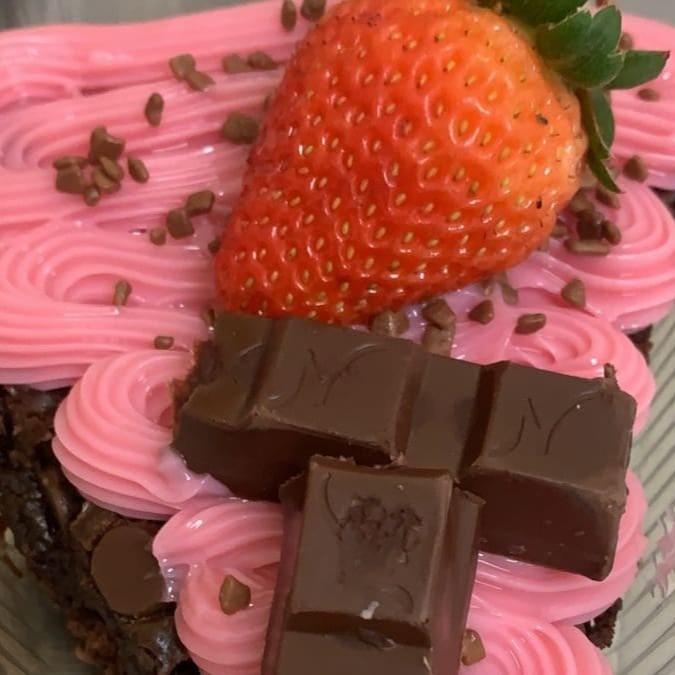 Receita Original de brownie coberto com Brigadeiro de morango, Chocolate stikadinho,Morango fresco e granulado Callebaut