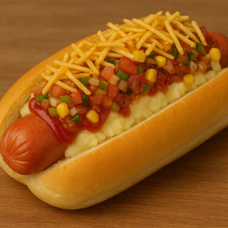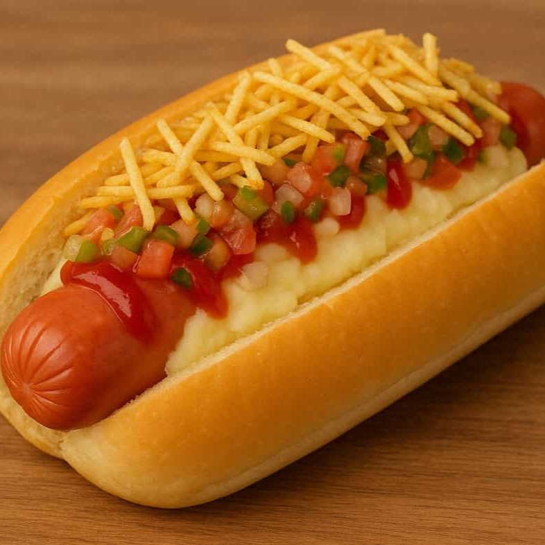 HOT DOG COMPLETO Pra quem gosta de tudo e mais um pouco! Pão macio, duas salsicha, molho especial, purê de batata, vinagrete, milho, bacon , queijo ralado e batata palha. Um hot dog bem servid
