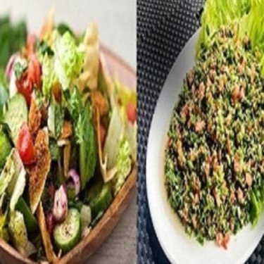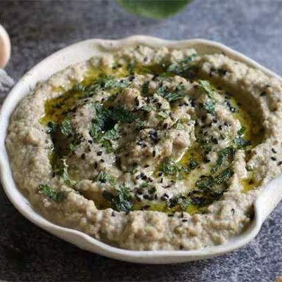 Pasta Típica Árabe á Base De Beringela e Tahine Com Pimentão,Cebolinha,Tomate Molho De Romã E Nozes Acompanha Dois Pães Sírios