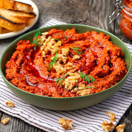Extrato De Pimentão Vermelho,Cebola Nozes,Salsa,Especiarias Árabes Acompanha Um Pão Sírio