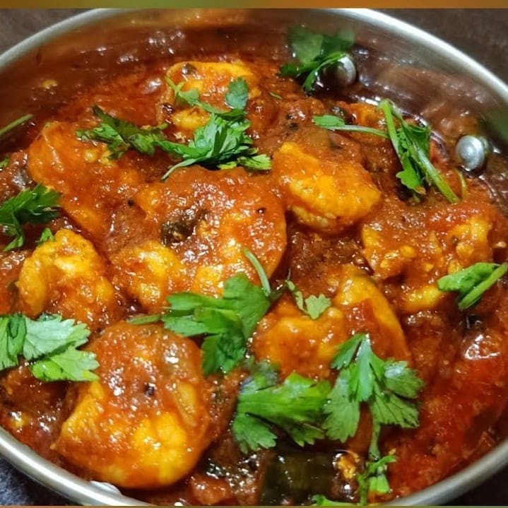(Camarões temperados com tomate,pimentao e cebola, cozido no molho Picante) (Shrimps tendered with tomatoes, bell peppers, and spicy onion and ginger gravy)