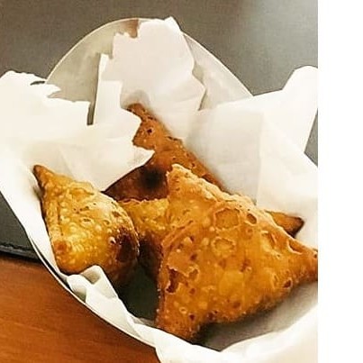 (Pastel frito com recheio de frango ) (Fried pastry with spiced chicken fillings)