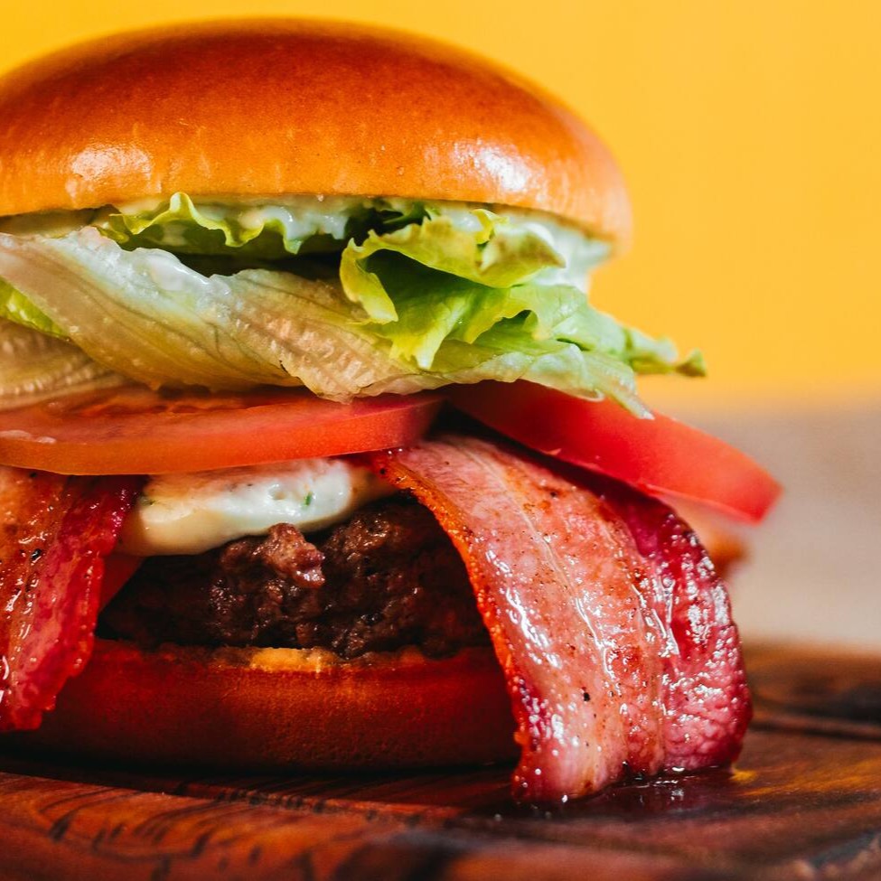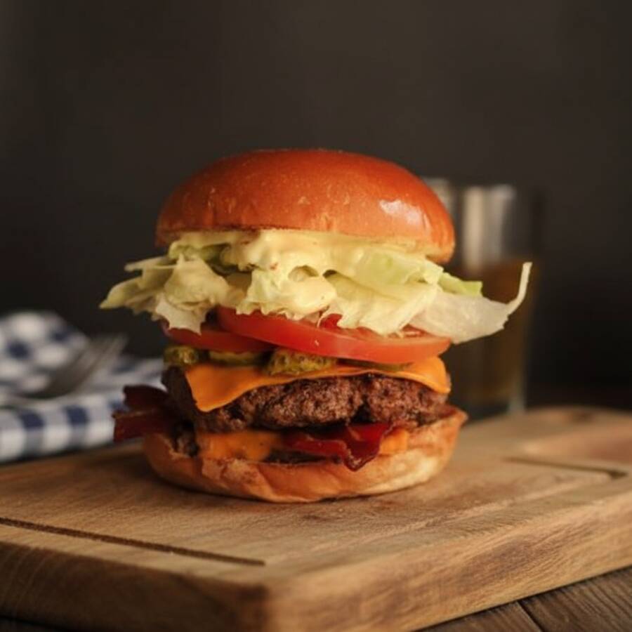 Um delicioso hambúrguer de fraldinha com uma camada generosa de queijo cheddar, bacon, alface, tomate e maionese especial da casa.