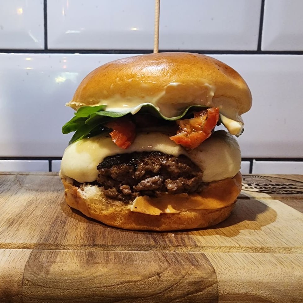 Pão de brioche com um delicioso hambúrguer de fraldinha, coberto com queijo de búfala, tomate seco, rúcula e maionese da casa.