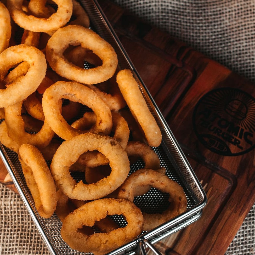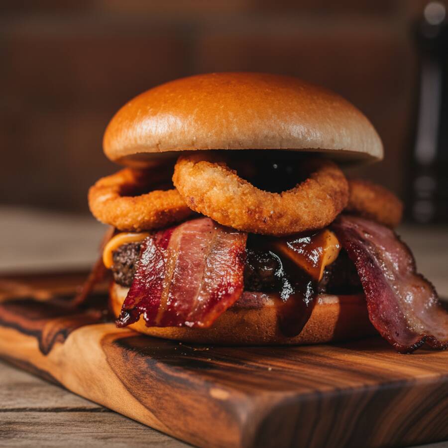 Pão de brioche com um delicioso hambúrguer de fraldinha, coberto com queijo cheddar, bacon, onion rings e molho barbecue.