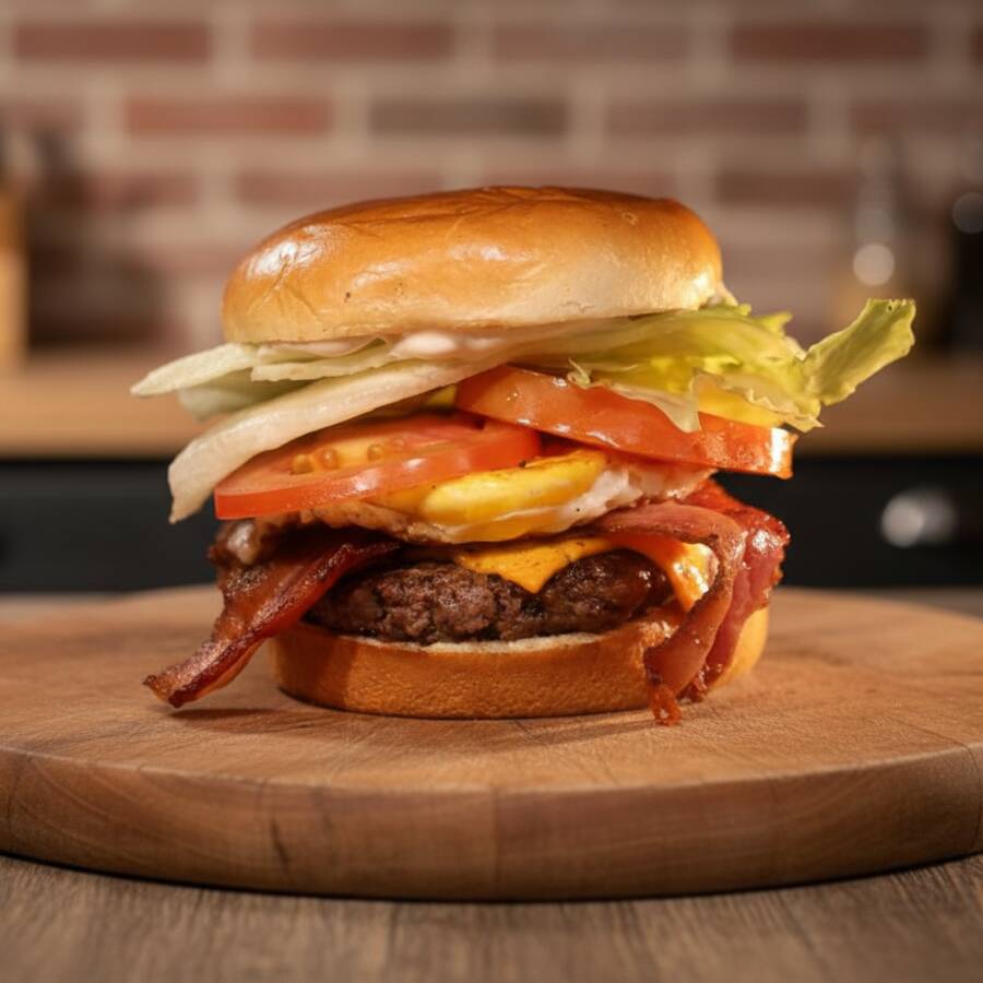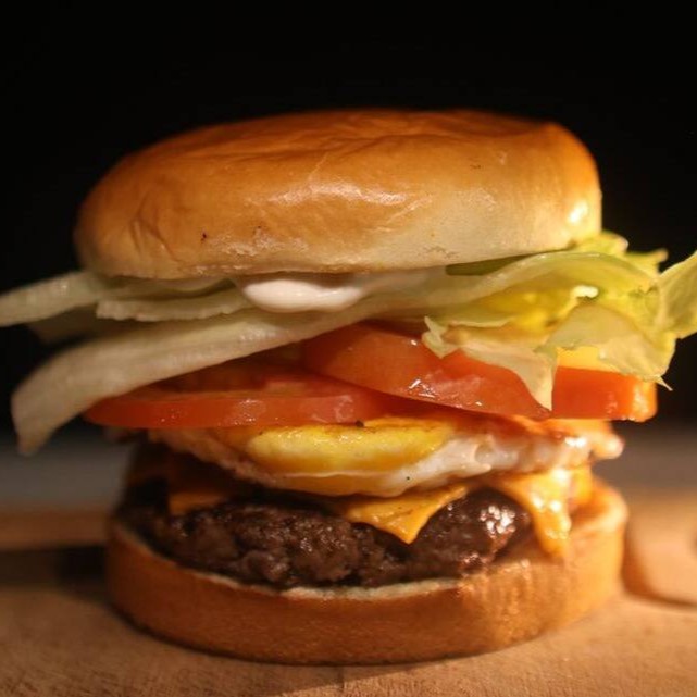 Um delicioso hambúrguer de fraldinha com uma camada generosa de queijo cheddar, ovo, bacon, alface, tomate e maionese especial da casa.