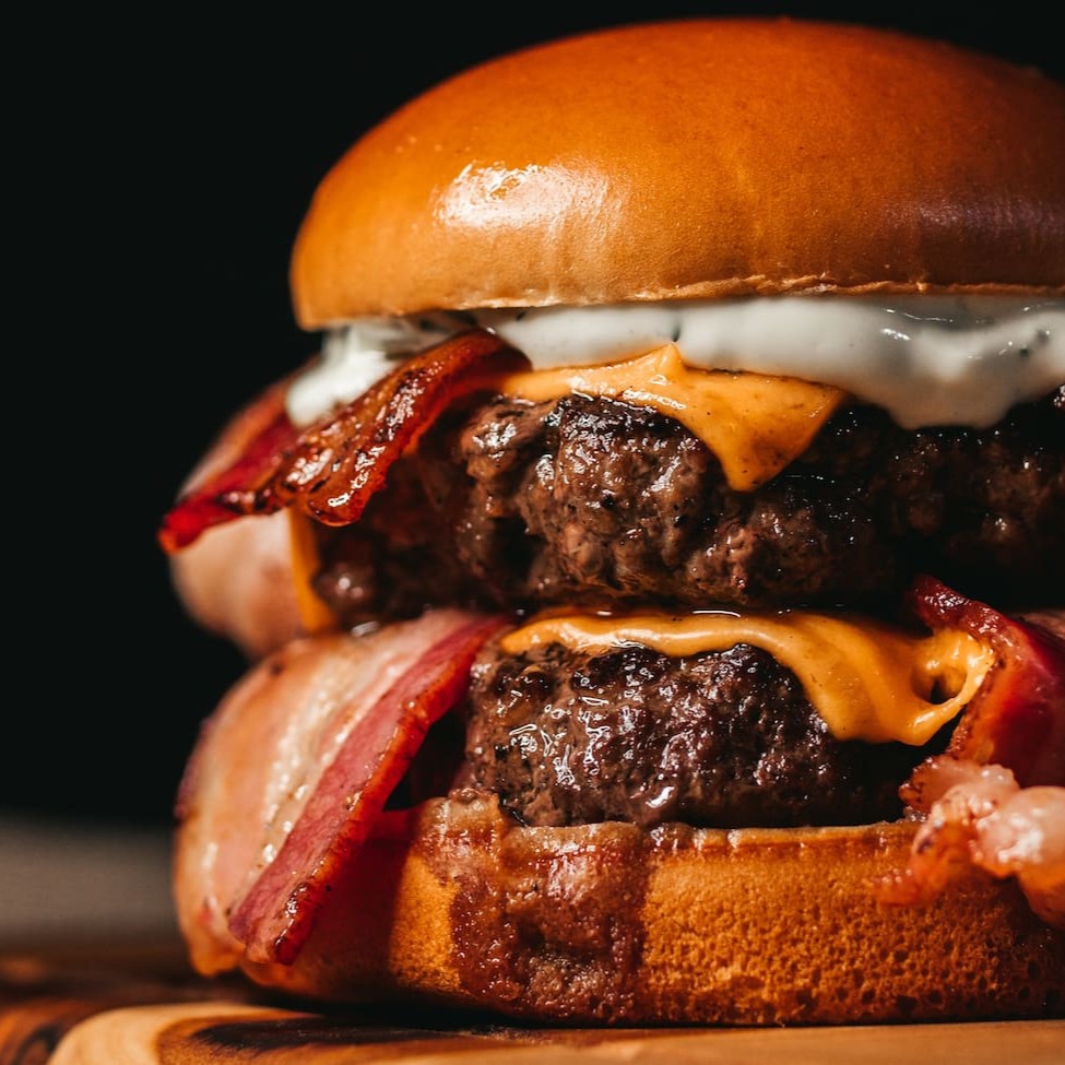 Pão de brioche com dois deliciosos hambúrguer de fraldinha, cada hambúrguer coberto com queijo cheddar e bacon, para finalizar maionese da casa.
