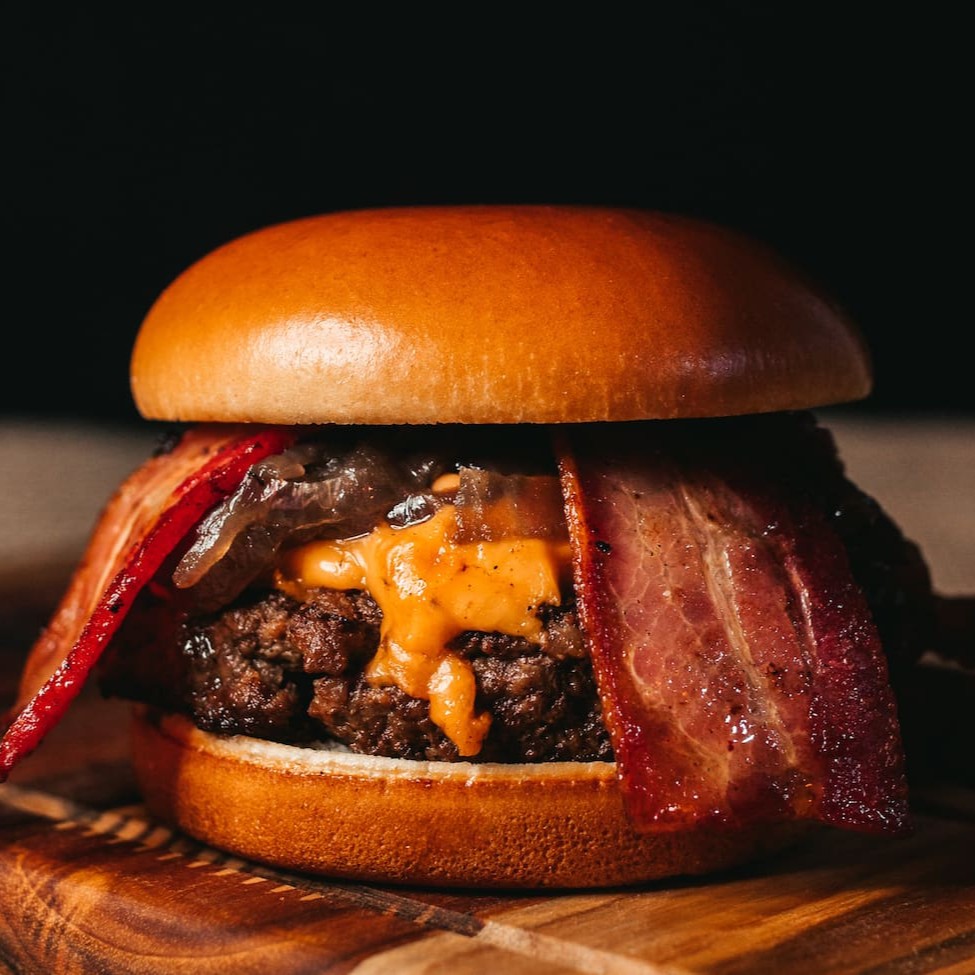 Pão de brioche com um delicioso hambúrguer de fraldinha, coberto com um molho cheddar caseiro, cebola roxa caramelizada e bacon.