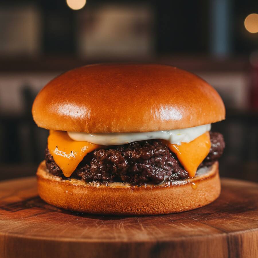 Um delicioso hambúrguer de fraldinha com uma camada generosa de queijo cheddar, alface, tomate e maionese especial da casa.