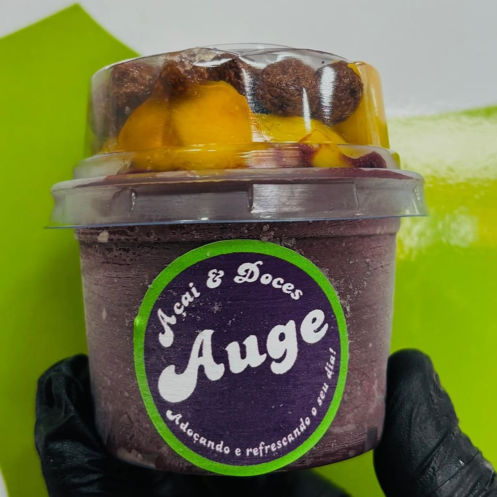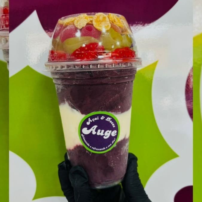 Escolha 4 frutas, 4 acompanhamentos e sorvete e se delicie com uma explosão de sabor do Açai natural super cremoso da Auge.