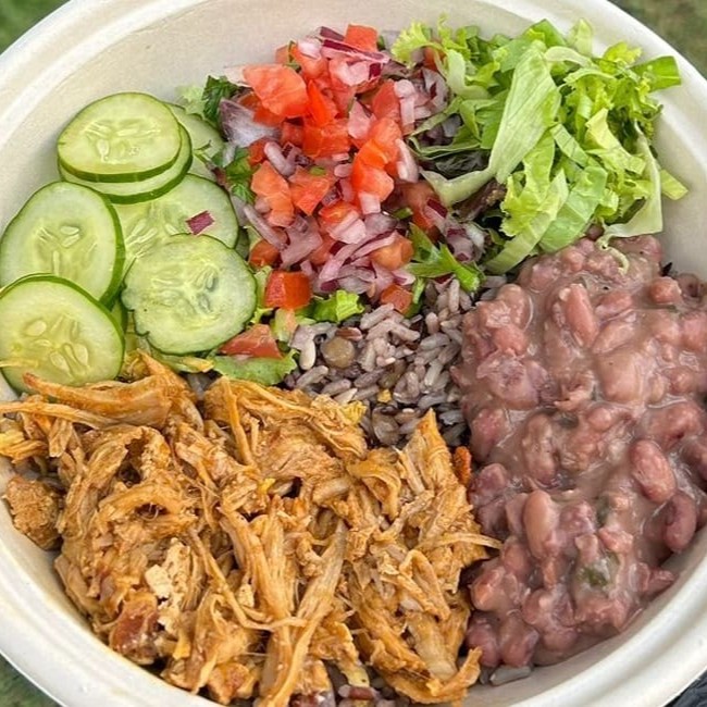 Experimente essa novidade! Uma refeição completa! Salada refrescante com alface, pepino em fatias, tomate e cebola roxa, arroz multigrãos rico em fibras, feijão vermelho deliciosamente preparado e Pulled Pork (carne suína desfiada), preparada com nossa receita exclusiva. Obs. Esse bowl não leva Avocado nem Guacamole