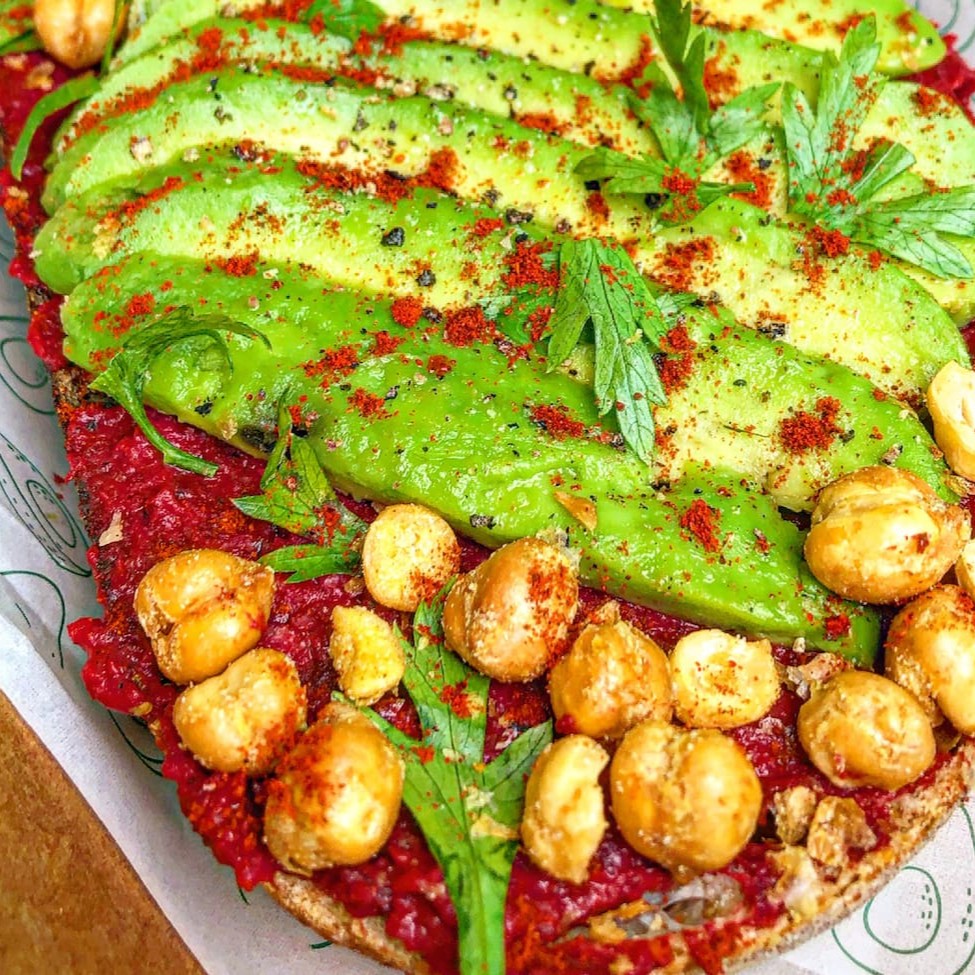 Avocado Toast com Hummus de Beterraba Sabores e texturas únicas! Nosso pão de fermentação natural é levemente tostado para garantir crocância na medida certa. Sobre ele, uma camada vibrante de Hummus de Beterraba feito na casa, fatias generosas de Avocado fresco, grão-de-bico crocante, salsinha picada e um toque especial de páprica. Perfeito para quem busca uma opção leve, nutritiva e cheia de sab