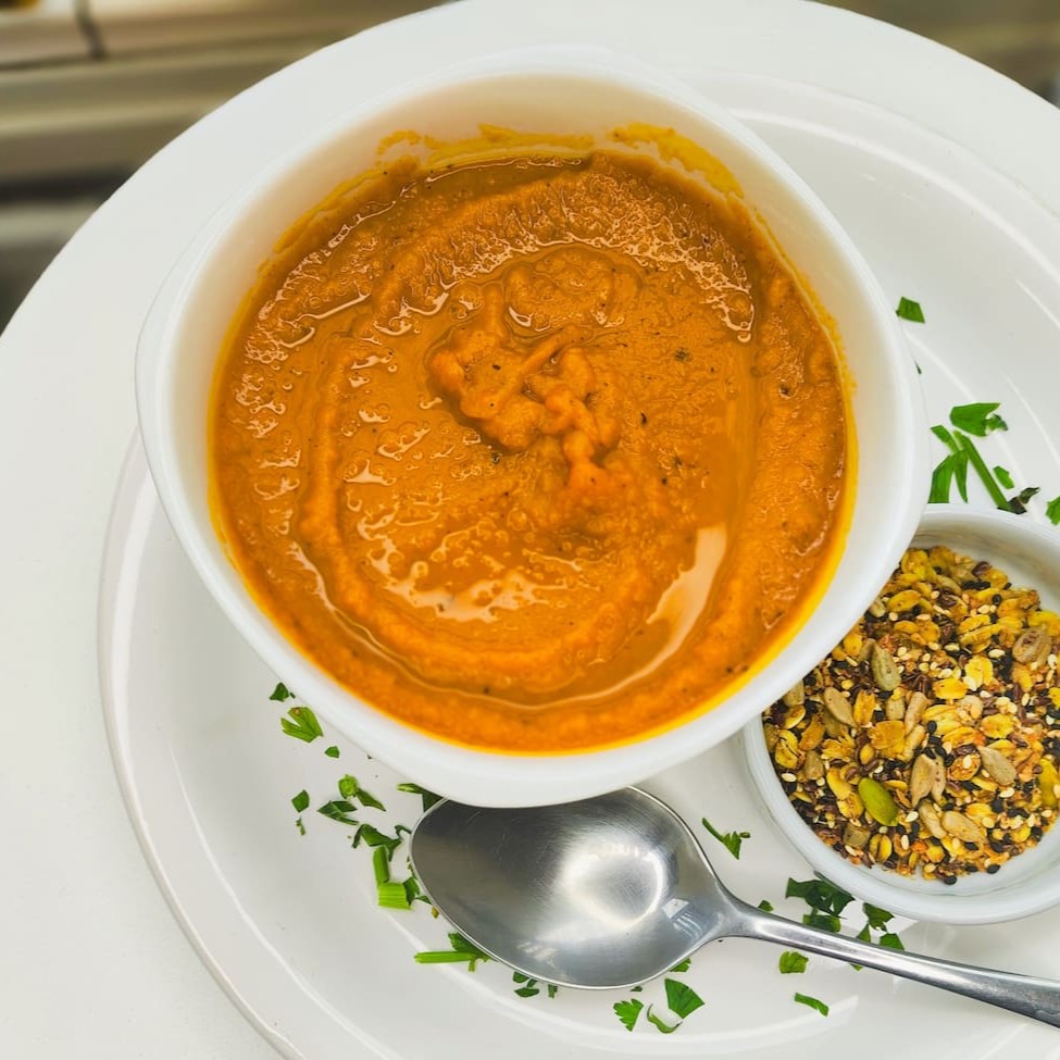 Sopa de abóbora japonesa cremosa, levemente doce com um toque de gengibre. Feita com ingrediente selecionados, temperos naturais de alho, cebola, salsa e páprica. Essa sopa é perfeita para dias quentes e frios, oferecendo aquela sensação de confort food. 420ml. Acompanha granola salgada, a parte. Pode haver mudança de coloração de acordo com o legume. *Neste prato não há alteração de ingredientes