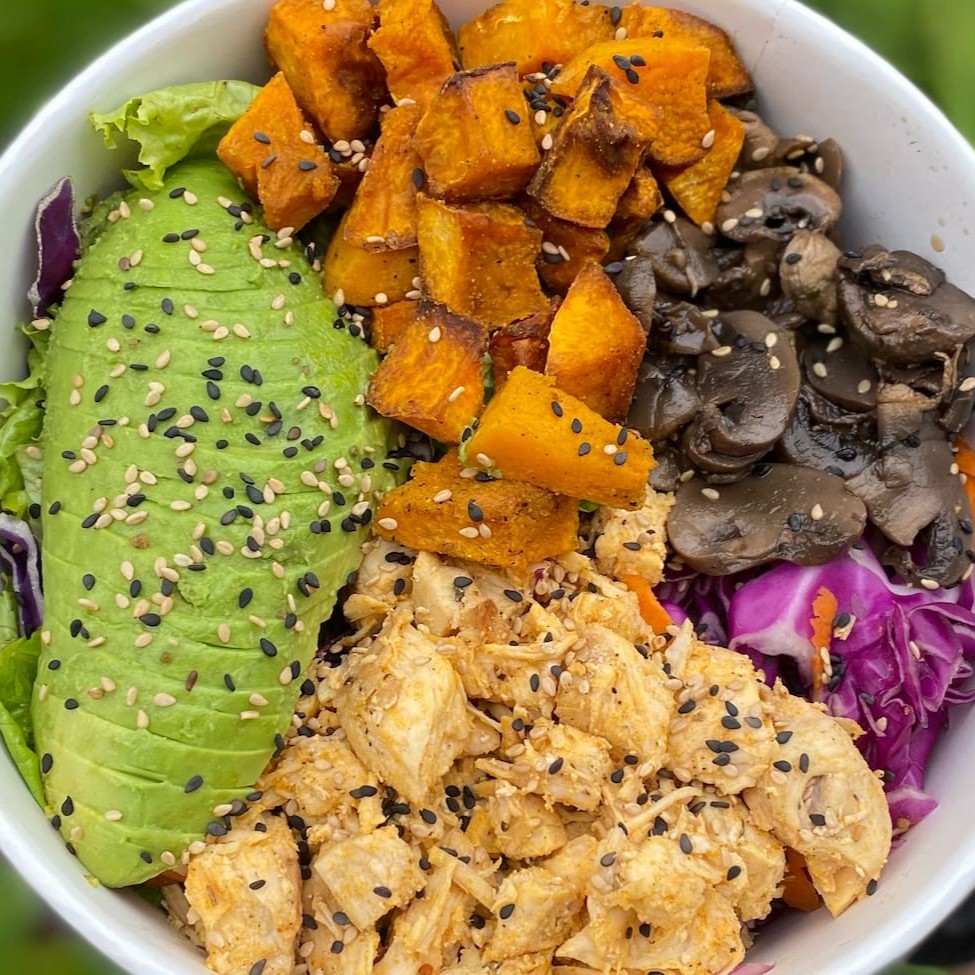 Uma explosão de sabores e texturas para sua refeição! Comece com uma base leve e crocante de folhas frescas, repolho roxo e cenoura. Por cima, 80g de cubos suculentos de peito de frango temperado, combinados com a doçura da abóbora japonesa (Cabotiá) assada e o sabor marcante dos cogumelos Shimeji salteados no shoyu. Para completar, fatias generosas de avocado maduro e um toque especial de furikak