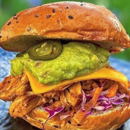 Num pão tipo brioche, um sanduíche que leva pulled pork (carne suína desfiada), american cheese, guacamole e asian slaw (saladinha asiática), temperada com aioli levemente picante. Se desejar, pode incluir pickles de pimenta Jalapeño bem picante (opcional sem custo extra).