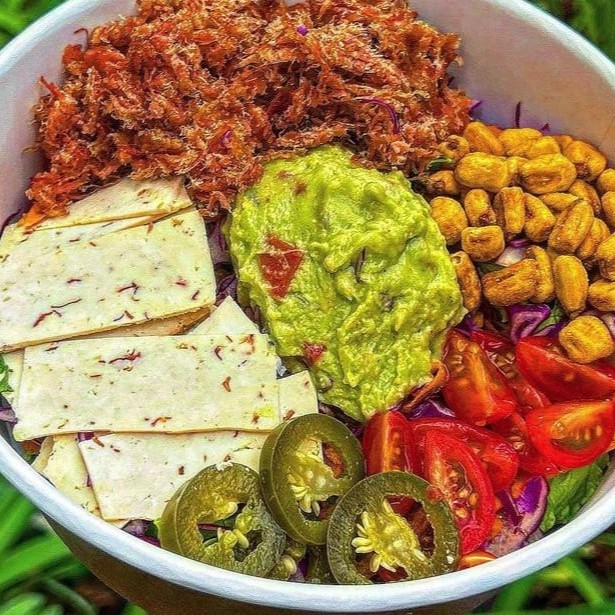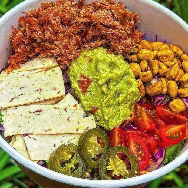 Bowl com inspiração Mexicana Irresistível ️ Uma explosão de sabores! Comece com uma base leve de folhas frescas, repolho roxo crocante e cenoura ralada. Por cima, um generoso mix de guacamole cremoso, pulled pork suculento (carne suína desfiada), lascas de queijo meia cura apimentado, tomatinhos doces, milho crocante e pickles de Jalapeño (opcional, mas altamente recomendado para os fãs de picânci