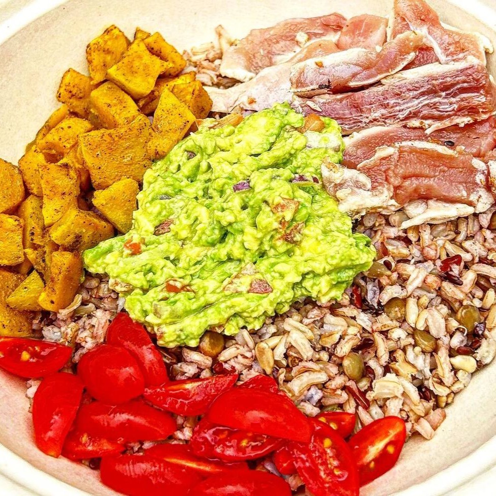 Frango Rice Bowl – leve, saboroso e cheio de energia! Um bowl irresistível com 200g de arroz multigrãos, base nutritiva e cheia de textura. Por cima, você encontra nosso cremoso e exclusivo guacamole (70g), feito com avocados frescos e selecionados. Para completar, trazemos a doçura leve da abóbora cabotiá assada (50g) e cubinhos suculentos de peito de frango temperado (80g), tudo finalizado com t