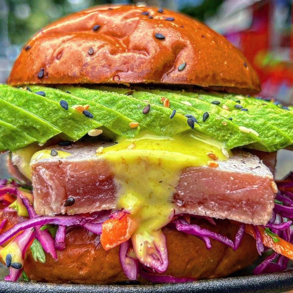 Sanduíche feito com pão brioche artesanal, dois medalhões de Atum fresco selados e cortados ao meio, avocado fatiado, Asian Slaw (saladinha asiática), duas opções de Mayo: Wasabi (suave) ou Sriracha (picante) e Furikake (tempero japonês crocante a base de gergelim torrado).