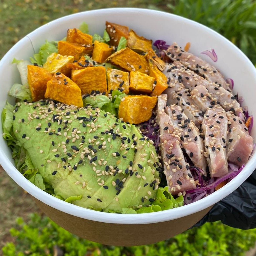 Maravilhosa salada, cheia de coisas gostosas. Mix de folhas frescas e salada asiática cobertas com abóbora japonesa (Cabotian) assada e salteada na chapa, 80g de atum fresco selado e cortado em tiras, coroado com Avocado fatiado. Tudo salpicado com furikake (tempero japonês à base de gergelim). Acompanha delicioso molho à base de amendoim, super Umami!