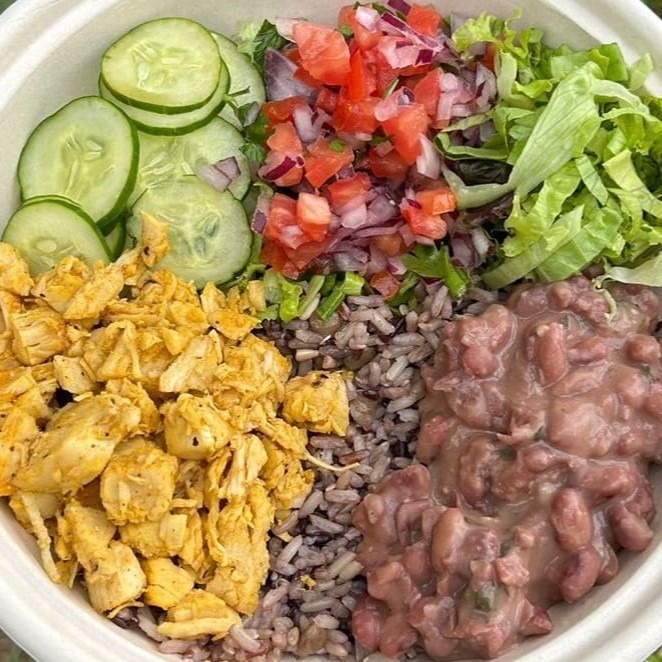 Novidade irresistível! Seu bowl completo, leve e saboroso Descubra o equilíbrio perfeito entre sabor e nutrição: uma salada super refrescante com alface crocante, pepino em fatias finas, tomate suculento e cebola roxa. Acompanhando, arroz multigrãos rico em fibras e feijão vermelho bem temperado, para dar energia e saciedade. Tudo isso com cubinhos macios de peito de frango, temperados com carinh