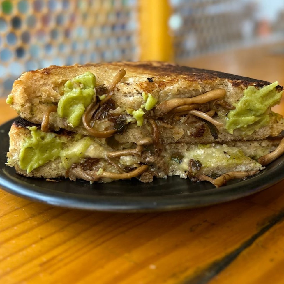 "Nosso sanduíche tipo ""queijo quente"" feito com pão de fermentação natural, generosamente recheado com mussarela, cebolinha, cogumelos shimeji salteados e pasta de Avocado. (Não é possível a alteração de ingredientes nesse Sanduíche.)"