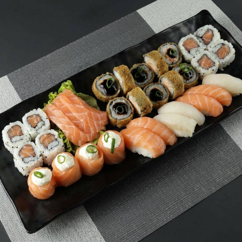 Combinado de 50 peças é uma verdadeira festa de sabores! Com 8 sashimis fresquinhos, 10 hot rolls crocantes, 8 uramakis, 8 hossomakis, 8 joes e 8 niguiris, é a opção perfeita para compartilhar momentos especiais. Uma explosão de texturas e delícias da culinária japonesa em cada garfada!