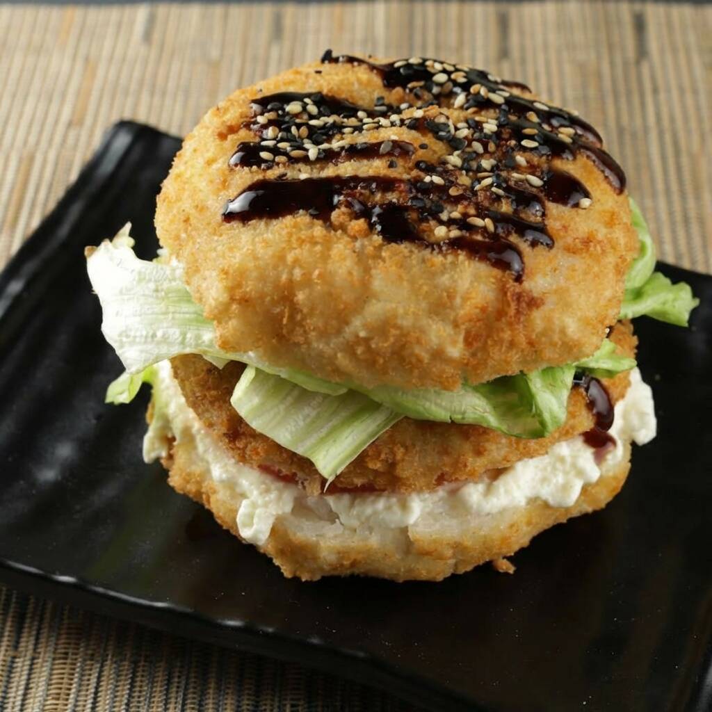 Pão de Arroz Crocante, burguer de Salmão Fresco Cru ou Grelhado, alface americana, cebola roxa em tiras, cream cheese e molho tare. Opção: Fios de Couve ou Batata doce e Nachos.