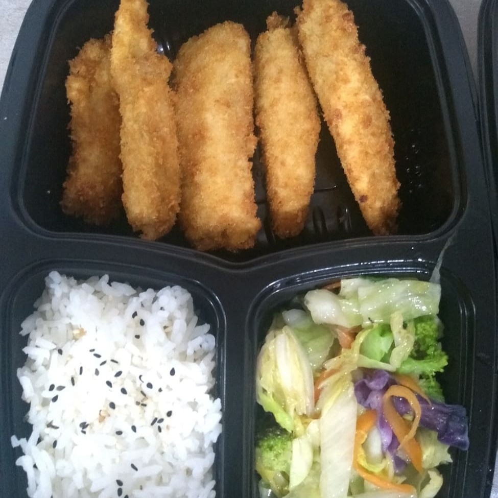 Tilapia empanada, mix de legumes e arroz japonês