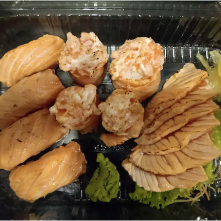 6 sashimi salmao,4 niguiri salmao, 4 dyo, 4 hossomaki pepino, 4 uramaki salmao