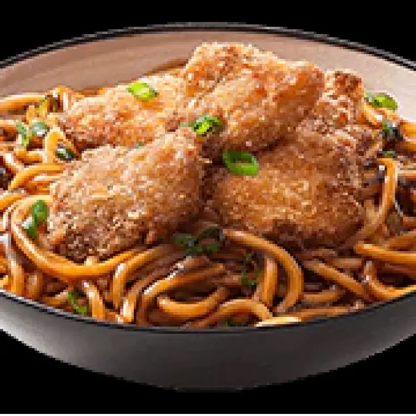 Macarrão com molho oriental da casa, com karaague (sobrecoxa dessossada, gengibre e shoyu) frito e cebolinha.