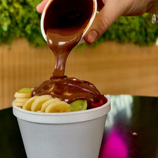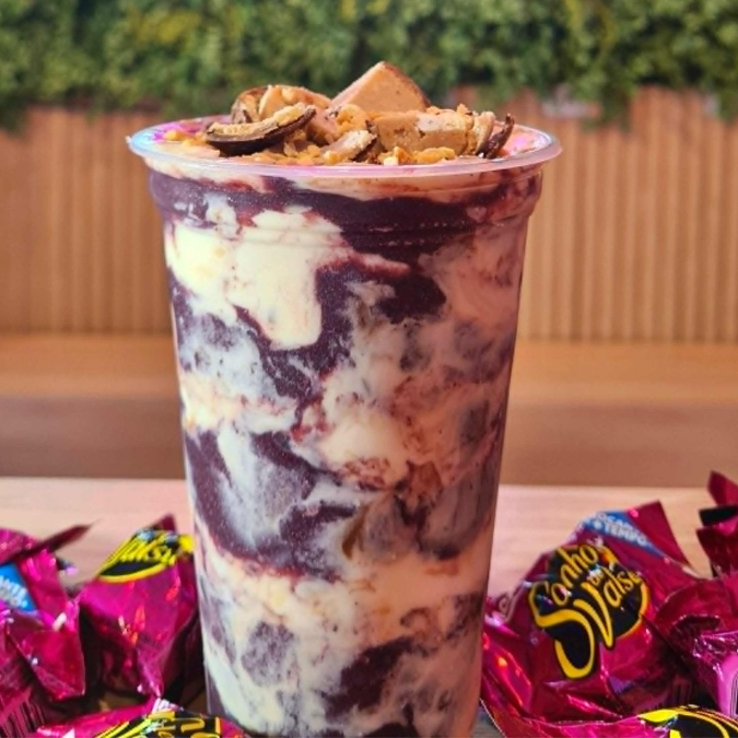Creme sabor Sonho de Valsa, combinação perfeita com o nosso açaí e finalizado com bombom Sonho de Valsa picado.