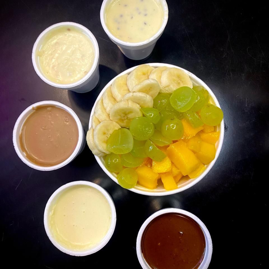 O Fondue de Cremes Especiais acompanha um pote de 360ml de frutas de sua escolha + um pote de 100 ml com o creme especial de sua escolha. (Se necessário aquecer 20seg no micro-ondas).
