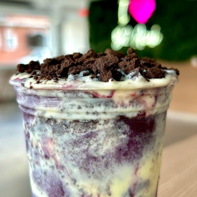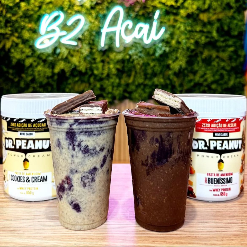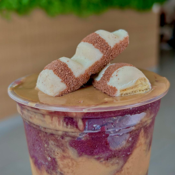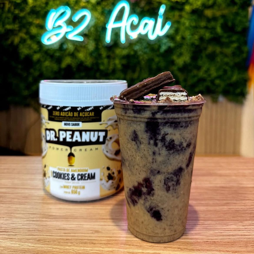 Açaí Zero recheado com a deliciosa pasta de amendoim sabor leite em pó da Dr. Peanut, e pra dar aquele toque especial do Majestoso escolhemos o biscoito NESFIT Cacau e Cereais triturada.