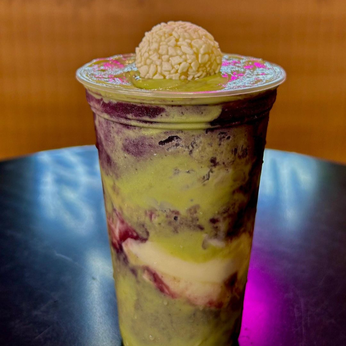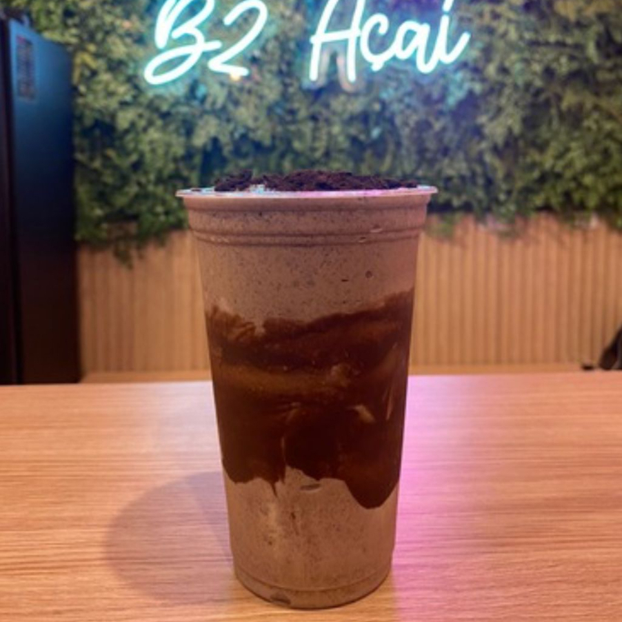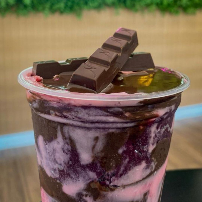 Açaí Zero recheado com o delicioso creme de leite ninho *ZERO* e pra dar aquele toque especial do Majestoso biscoito NESFIT Cacau e Cereais triturada.