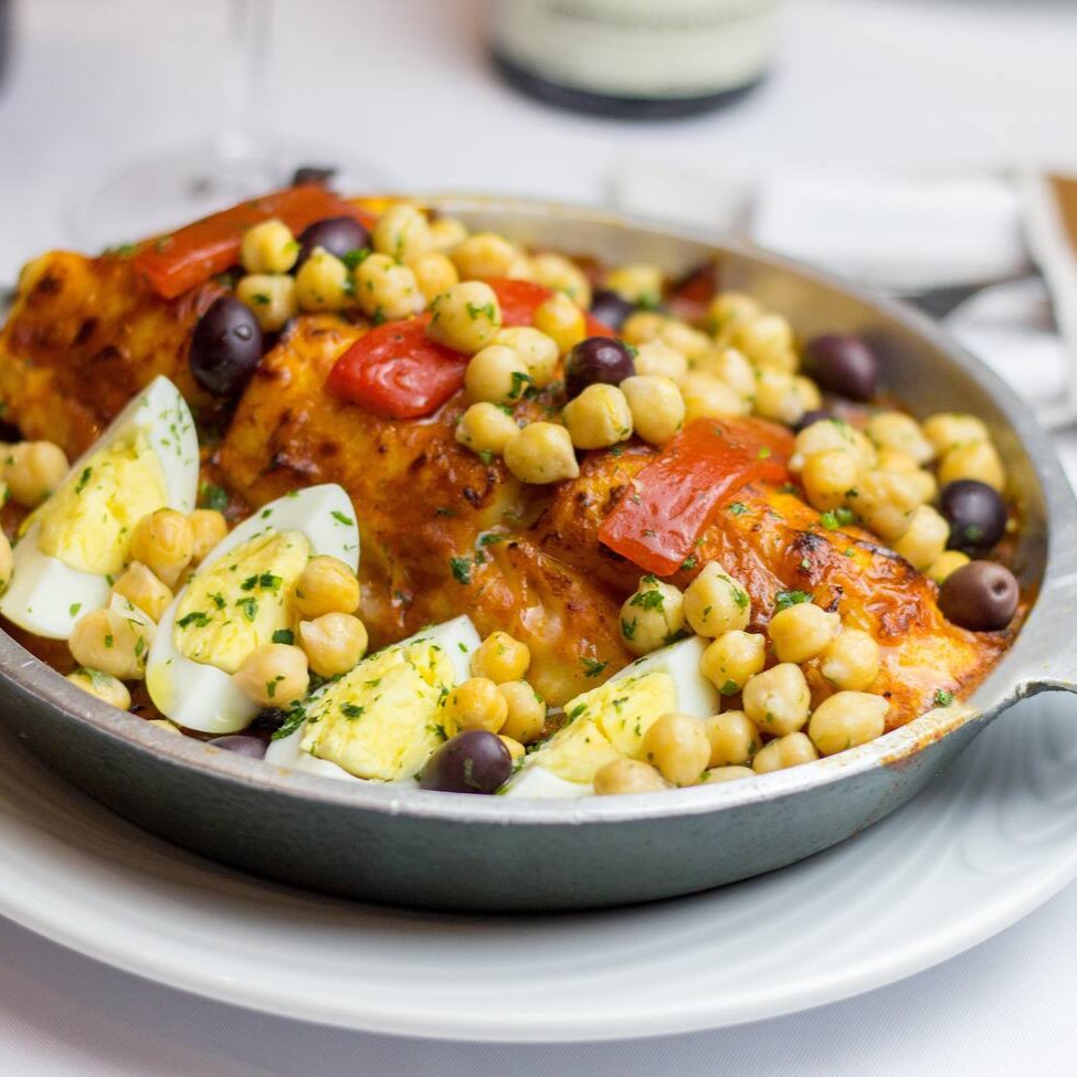 Posta inteira cozida com batatas cozidas, cebola, ovos cozidos, azeitonas portuguesas, molho de tomate a nossa moda, pimentões e grão de bico. Tudo gratinado ao forno.