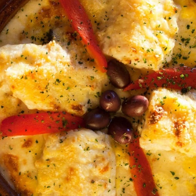 Bacalhau em nacos com batatas cozidas, cebola, molho bechamel, Catupiry e pimentão vermelho. Tudo gratinado com parmesão ao forno.